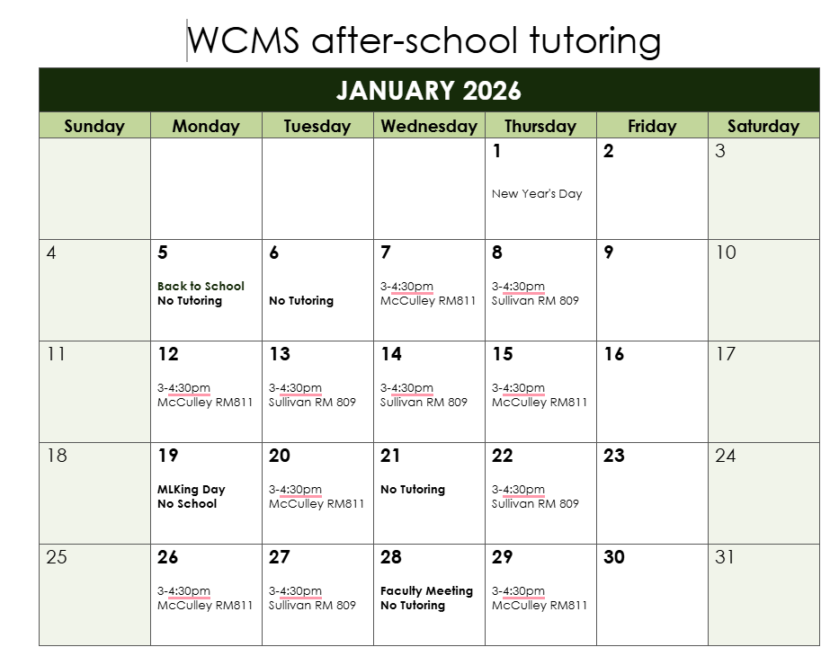 If your child's grade is not at an acceptable level, please remember that we offer tutoring both before and after school. Morning Tutoring takes place Tuesday through Friday, 7 am-7:45 am, and Afternoon Tutoring will take place on the following days and times: